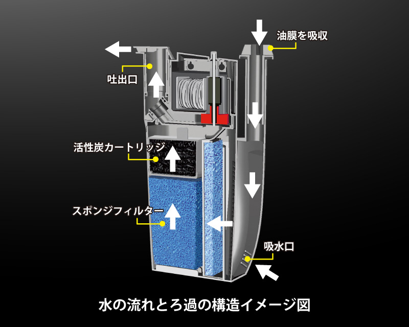 機能満載!サーフェススキマーで取り込んだ油膜汚れを水中フィルターで分解